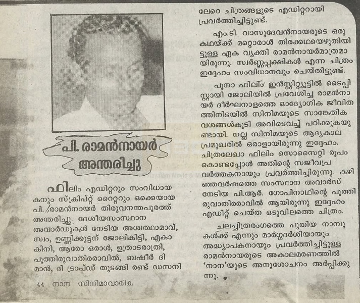 മലയാളം സിനിമാ ലോകത്തിന് സംഭാവന ചെയ്ത അതുല്യപ്രതിഭകളിലൊരാളായ ഫിലിം എഡിറ്റർ പി രാമൻ നായർ എന്ന പി ആർ നായർ തിരുവനന്തപുരത്താണ് ജനിച്ചത്.